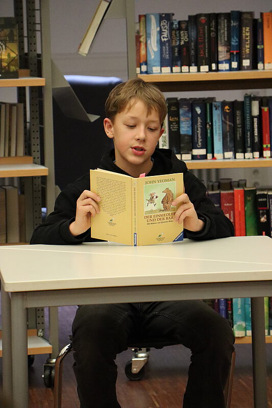Am Ende des Wettbewerbs setzte sich nach zwei Runden der einzige Junge im Teilnehmerfeld durch: Elia, 6e. Mit seinem Auszug aus „Der Einsiedler und der Bär“ von John Yeoman sowie seiner souveränen Vortragsweise beim Fremdtext überzeugte er die Jury rundum und holte er sich den Sieg.