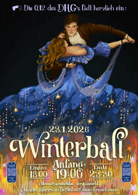 Ab heute können Sie Karten für den Winterball unter diesem Link vorreservieren. Die Abholung und ggf. Bezahlung in bar erfolgt dann ab 12. Januar 2026 im Oberstufensekretariat der Schule. Das lässt uns Zeit, die Plätze an unseren 8-er-Tischen im Forum und der Kleinen Aula zuzuweisen. Natürlich wird es auch wieder „Stehplatzkarten“ ohne zugewiesenen Tisch geben, für alle, die ohnehin den ganzen Abend auf den Beinen sein wollen (oder es sich in der Lounge – diesmal vor dem Lehrerzimmer – bequem machen wollen).