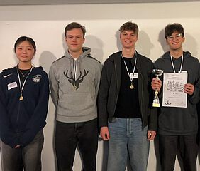 Großer Schacherfolg für die Mannschaft des DHG: Bei den unterfränkischen Schulschachmeisterschaften gewann ein Team der Oberstufe in Wettkampfklasse 1 einen herausragenden ersten Platz. Friedrich (q13), Elmo, Ben (q12) und Linxi (10c) überzeugten in sieben Runden mit Verstand, Gelassenheit und Tempo und ließen die Konkurrenz aus den anderen Gymnasien souverän hinter sich.