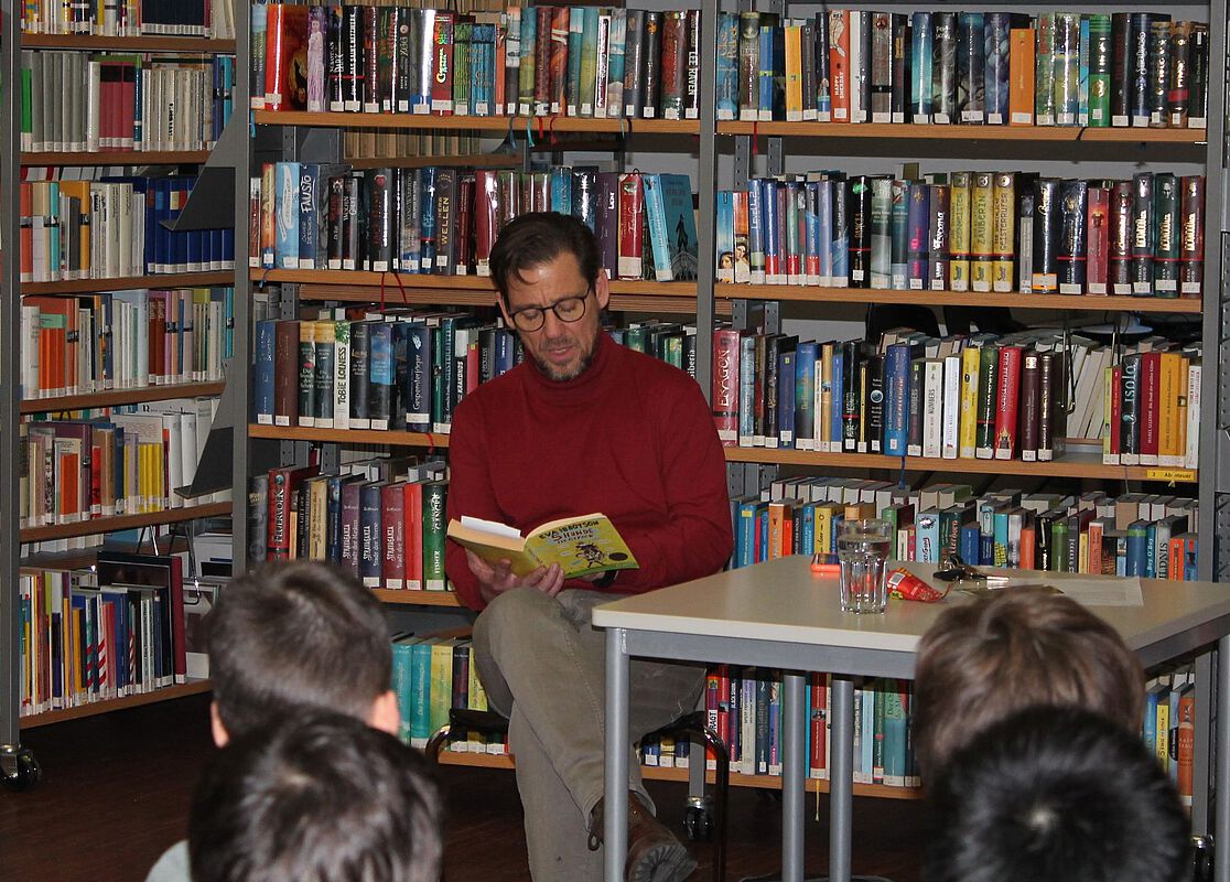 An Selbstlesefreude mangelt es also nicht, aber auch das Vorlesen wird dankbar und mit großen Ohren aufgenommen. Zum Vorlesetag haben sich wieder viele Lehrkräfte aus verschiedenen Fächern und auch Sekretärin Frau Frank bereit erklärt, die Unterstufe zu unterhalten. So kommen alle fünften, sechsten und siebten Klassen in den Genuss einer freitäglichen Vorlesestunde. Bücher über Hunde, Monster, Fliegen und rosa Kaninchen kommen da zum Einsatz; in vielen Klassenzimmern, auch im Kunstraum wird gelesen. Am schönsten haben es die Kinder aus den fünften Klassen, für die Frau Grypa, die den Vorlesetag organisiert hat, die Bibliothek hergerichtet hat. Die vielen tollen Bücher vor Augen und die unterhaltsamen Texte im Ohr animieren die Kinder ganz sicher zum Weiterlesen!